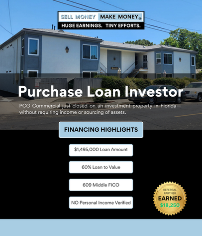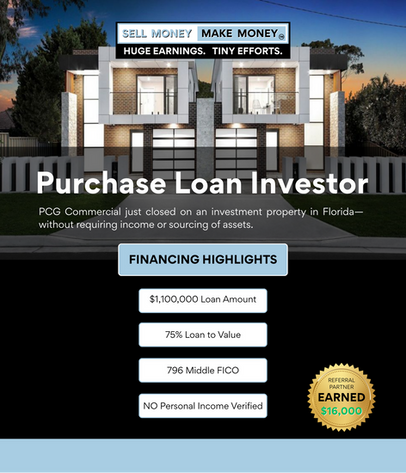 Join PCG Commercial's SellMoneyMakeMoney™ Referral Program, designed exclusively for real estate professionals who want to earn substantial commissions by referring real estate investors to secure funding through PCG Commercial. With over two decades of experience funding investors nationwide, we provide access to virtually every loan program available in today’s market—ensuring your clients get the financing they need while you earn more on every deal.