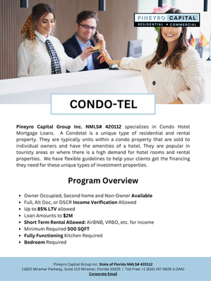 Pineyro Capital Group Inc. — NMLS #420112 Residential Division — offers a full suite of Consumer Purpose home financing solutions designed for individuals purchasing or refinancing a primary residence or second home. Our simplified process delivers fast approvals, flexible options, and competitive pricing to support a smooth, stress-free lending experience. Empower your clients to achieve their homeownership goals with confidence — we make the financing straightforward, efficient, and reliable.